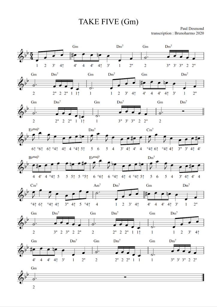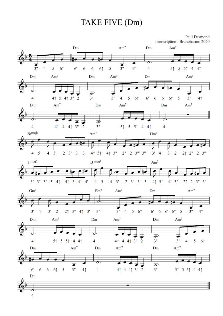 La première difficulté de Take Five est son célèbre rythme en 5/4. Prenez le temps d’écouter le morceau original pour bien intégrer le groove.